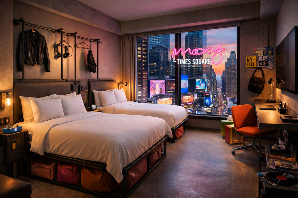 Moxy Times Square is a modern hotel designed for younger travelers and short city stays.